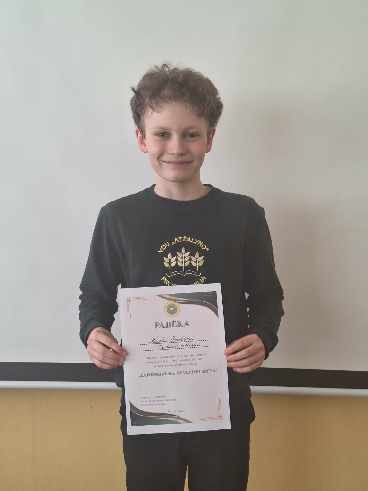 Didžiuojamės 6b kl mokiniu RAPOLU ŠIMOLIŪNU, dalyvavusiu Respublikiniame bendrojo ugdymo mokyklų 5-8 kl integruotame literatūros ir informatikos dienoraščio konkurse ,, LAIMINGIAUSIA GYVENIMO DIENA" ir apdovanotu rengėjų padėka. Rapolo literatūros mokytoja Asta Aleknienė, informacinių technologijų- Lina Plečkaitienė.