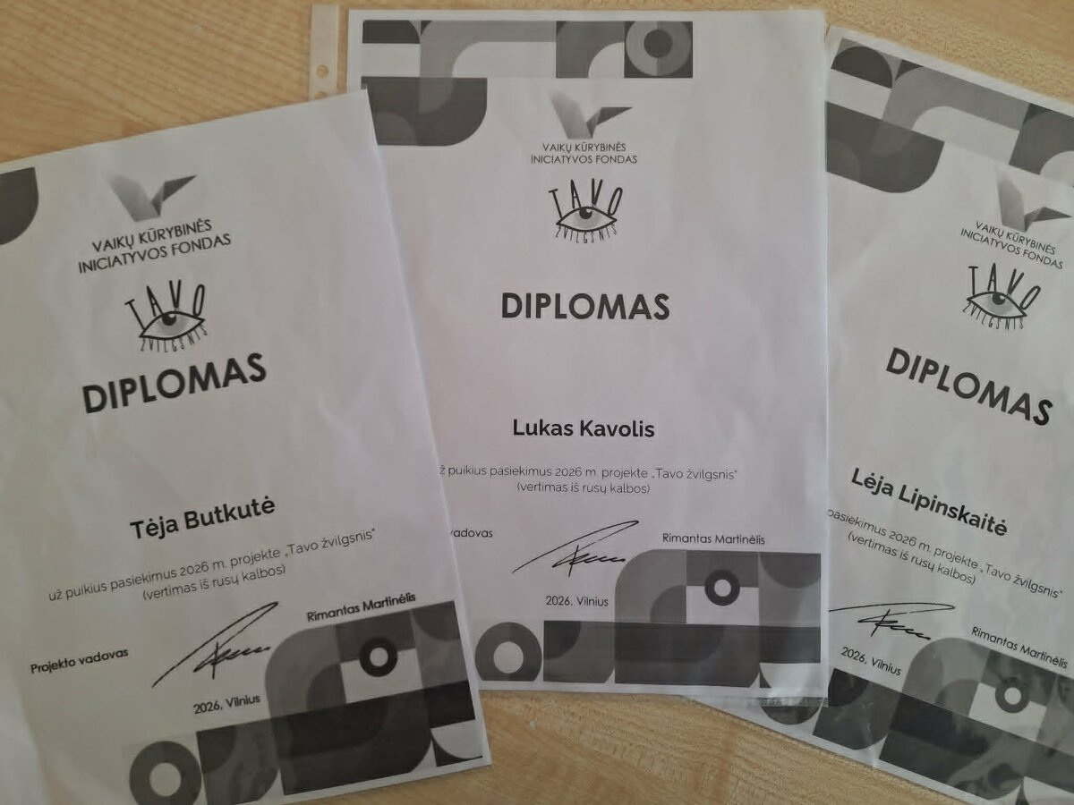 Vaikų kūrybinės iniciatyvos fondas už dalyvavimą ir puikius pasiekimus 2026 m projekte "Tavo žvilgsnis" (vertimas iš rusų kalbos) padėkomis apdovanojo šiuos mokinius: Adrijaną, Dariją ir Emą, 5a kl, Jaroslavą, 6b kl, Karilę, 7a kl, diplomais- Lėją, 5c kl, Tėją, 6b kl ir Luką, 8c kl. Mokinius konkursui rengė rusų kalbos mokytoja Laima Toločkienė.