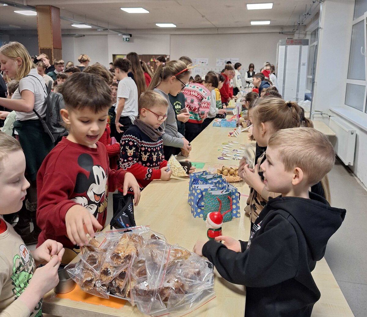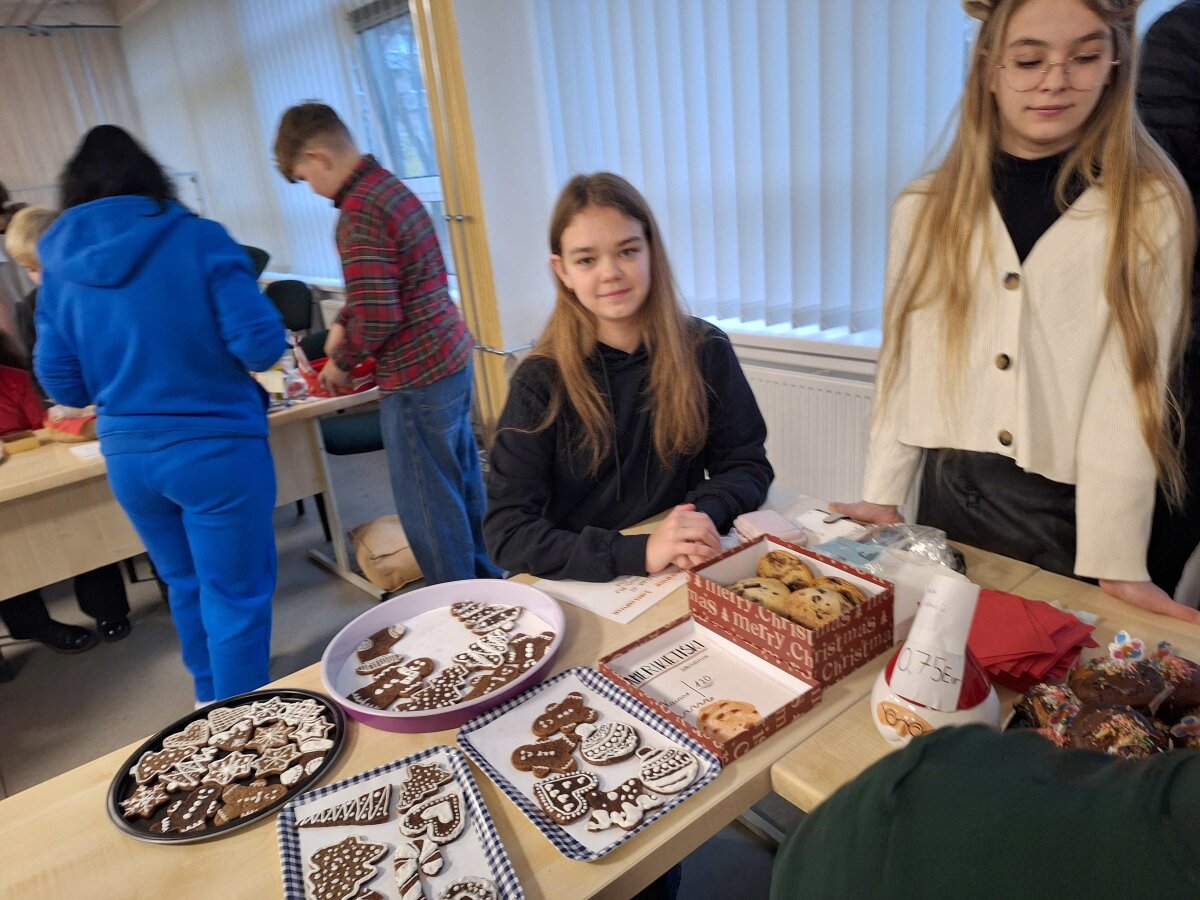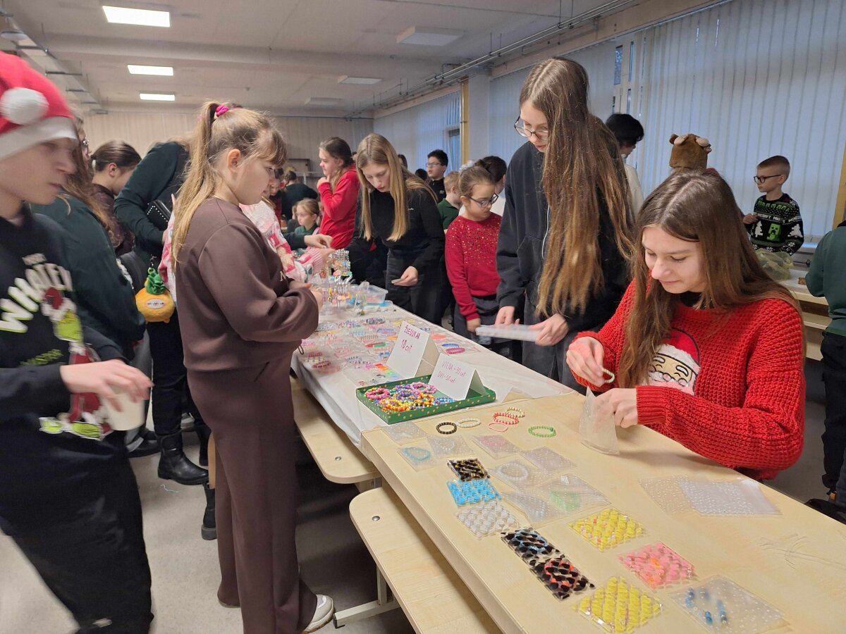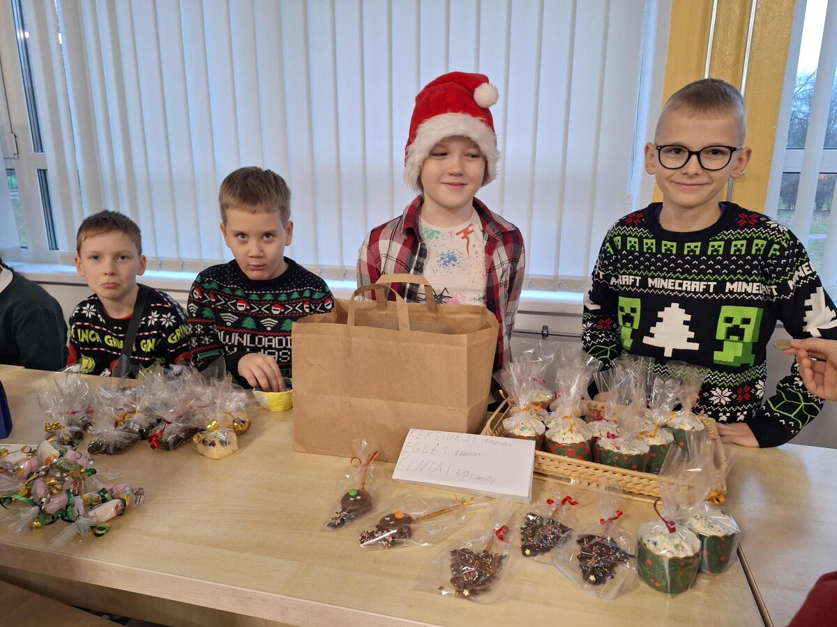 Štai ir liko tik vienas žingsnelis iki Naujųjų metų. Pirmadienį progimnazijos valgykla skambėjo nuo kalėdinės mugės dalyvių šurmulio, kur mokiniai prekiavo savo ar tėvelių dirbiniais. Ir prekiautojai, ir pirkėjai vos tilpo į erdvią valgyklos salę... Iš aš ten buvau, akys nuo grožio mirgėjo, nuo skonio ir kvapų galva svaigo, pinigėliai kišenę draskė...