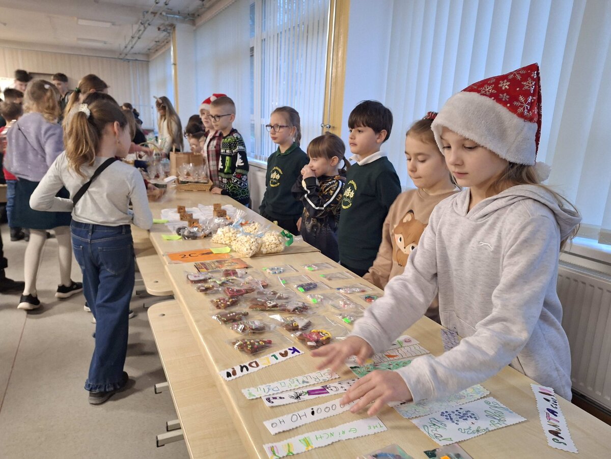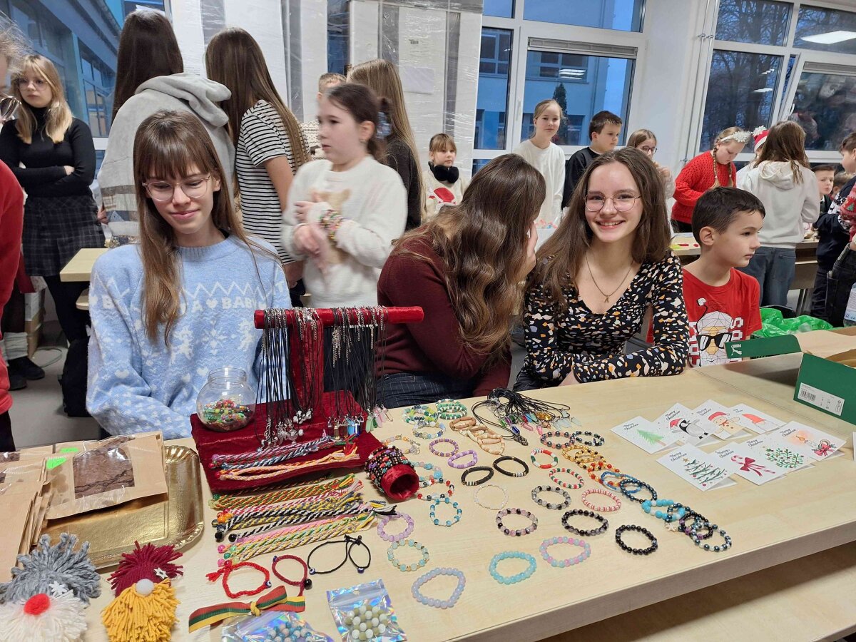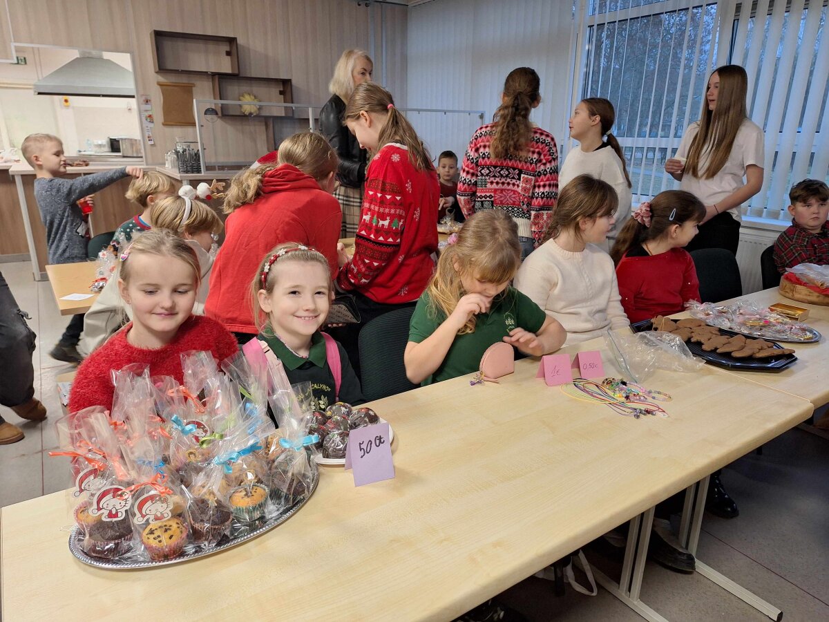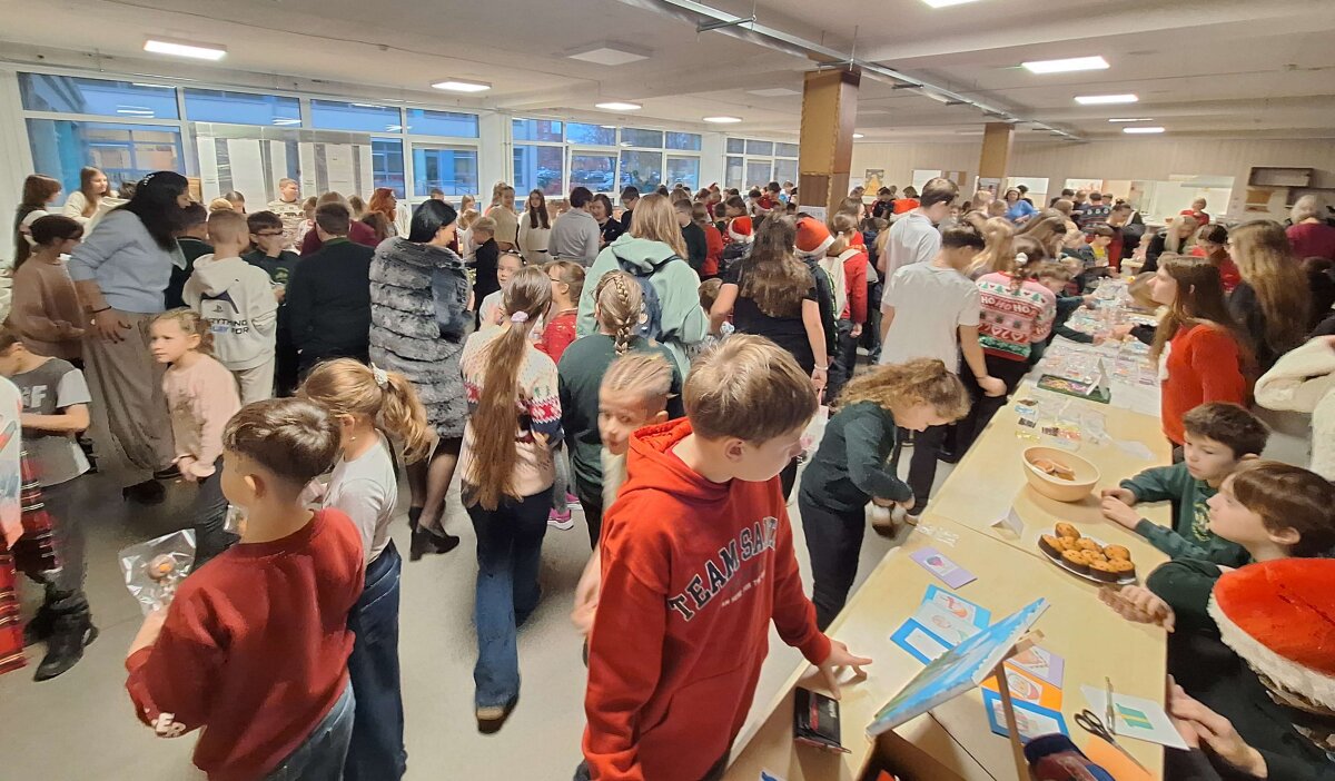 Štai ir liko tik vienas žingsnelis iki Naujųjų metų. Pirmadienį progimnazijos valgykla skambėjo nuo kalėdinės mugės dalyvių šurmulio, kur mokiniai prekiavo savo ar tėvelių dirbiniais. Ir prekiautojai, ir pirkėjai vos tilpo į erdvią valgyklos salę... Iš aš ten buvau, akys nuo grožio mirgėjo, nuo skonio ir kvapų galva svaigo, pinigėliai kišenę draskė...